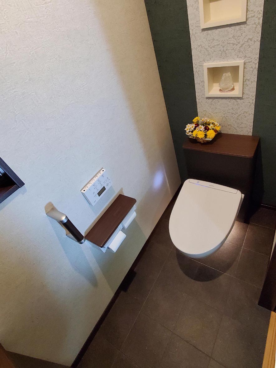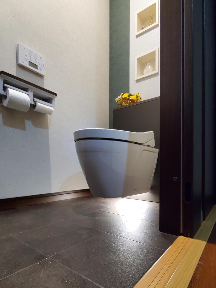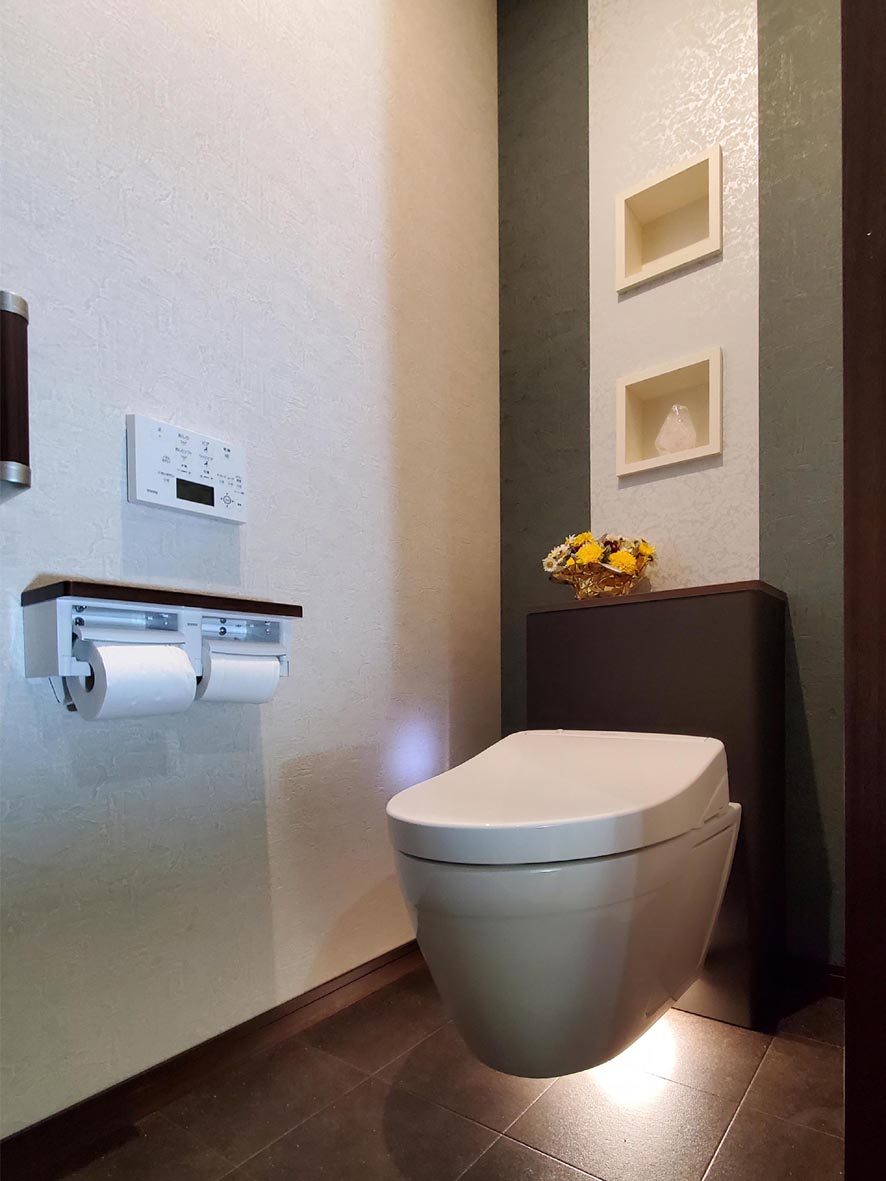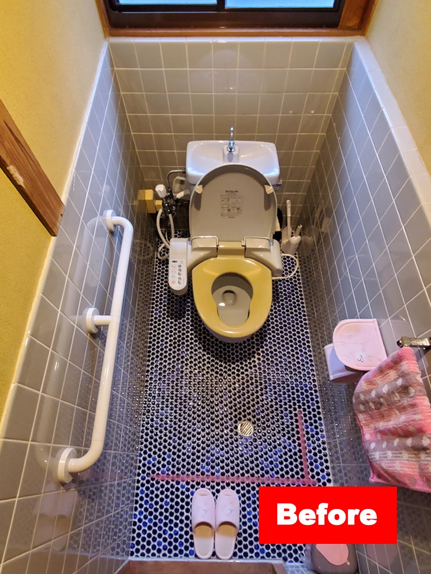 リフォーム事例 N邸(三次市) 内容 : トイレリフォーム工事 費用 : 92万円 工期 : 1週間 築年数 : 50年 施工面積 : 2㎡ メモ : 床と腰壁がタイルの在来トイレを、掃除しやすいフローティングデザインの便器に。やわらかなフロアライトがさらに浮遊感を演出。 前の事例へ 事例一覧へ 次の事例へ